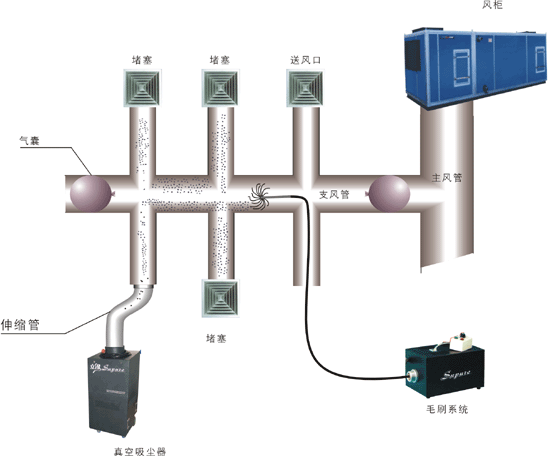 利用空气负压机的大排气量使密闭管道内形成高流速、低真空的负压状态,通过机械方式、流体力学方式的刷、吹、震动等动作 ,使管道壁上的灰尘脱落,脱落的灰尘被高速气流运输到空气负压机,在通过空气负压机的初、中、高效三级过滤器时被阻截、收集,过滤后的空气被排放出去。清洗后的管道用长效消毒剂对管道进行雾化消毒,使管道内长期保持干净、卫生。